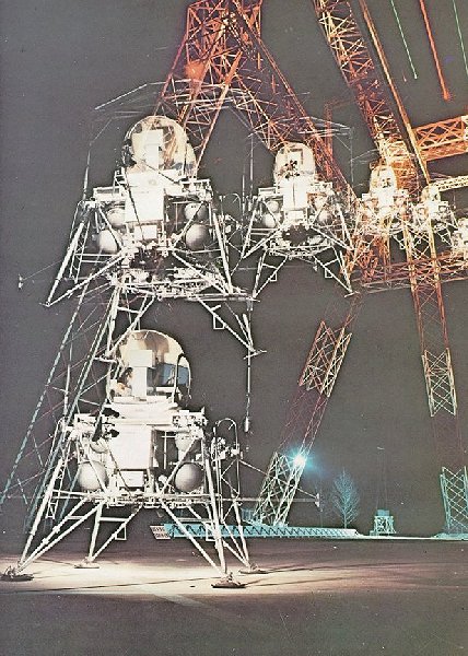 | Coming down easy on an unknown surface with limited fuel would take great piloting skill. This giant gantry at the Langley Research Center was used by research pilots to aid LM design, and to explore piloting techniques having the least risk of damage or upset. This multiple-exposure shot shows a landing with little forward movement at touchdown. |