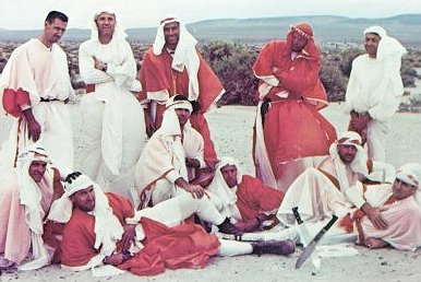 | Desert survival training was part of the regular program of what-ifs. If any flight had ended with an emergency landing in a desert, sun-protective dress and tents could have been fashioned from spacecraft parachutes. The astronauts were taught the best tricks for survival in the desert. Left to right, seated: Borman, Lovell, Young, Conrad, McDivitt, White. Standing: training officer Zedehar, Stafford, Slayton, Armstrong, and See. |