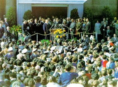 | Saying a few words to a sea of friendly faces was the lot of the Apollo 11 astronauts, whose world tour aboard Air Force One took them to a dizzying 24 countries in 45 days. |
