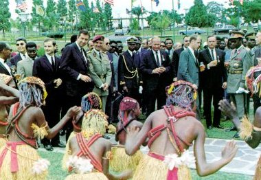 | Children of Kinshasa dance a special welcome for the men from the Moon. Tact, diplomacy, an iron constitution, and a knack for public speaking were what the astronauts needed on tours. |