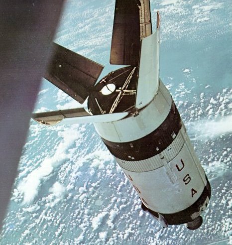 | Lifeless and slowly tumbling, the S-IB stage that put Apollo 7 in orbit gave Astronauts Schirra, Eisele, and Cunningham man's first ride atop a load of liquid hydrogen. Now the spent 59-foot stage served as a passive target for practice in rendezvous, with one run starting from a distance of 80 miles. |