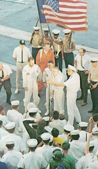 | An early-morning reception took place aboard the USS Yorktown in the Pacific on December 27, 1968. At left, Apollo 8 Commander Frank Borman thanked the crew for giving up Christmas at home so that the carrier could serve as the prime recovery ship. Astronauts Lovell and Anders stood beside Borman. |