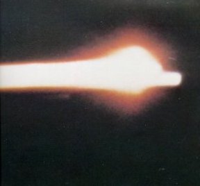 | Blazing across the sky, the Apollo 8 command module returns home. A Pan-Am pilot on his way to Honolulu from Fiji glimpsed the sight, and estimated that the fiery streak was as much as 125 miles long. The glowing tail made the spacecraft look like a meteor. This unusual photo was taken by a special USAF camera on a KC-135 aircraft at 40,000 feet. |