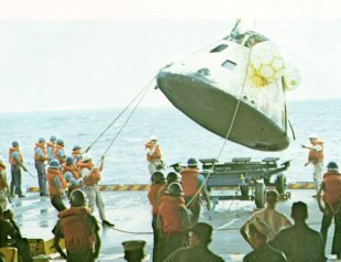 | Charred and dripping, the Apollo 8 command module is hoisted from the Pacific and eased down an its trailer aboard the USS Yorktown. Its remaining propellants have to be drained off and its precious film magazines recovered. Then spacecraft engineers will go over it carefully to study the effects of a trip around the Moon. |