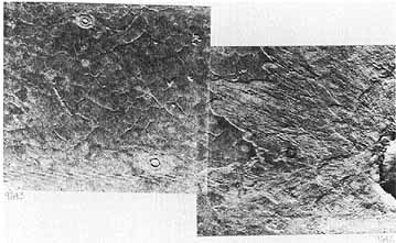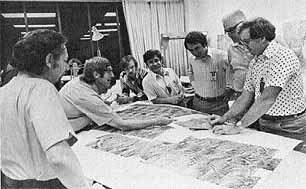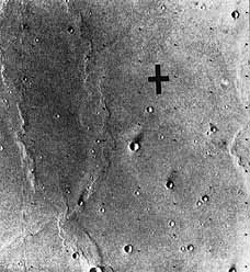 [347] Hal Masursky (above) on 12 July 1976 explains the geology apparent in the P22 photos. Jerry Soffen stands on his right. Across the mosaics, standing from right, are Tom Young, Jim Martin, Carl Sagan, Mike Carr, and an unidentified participant. Photo taken by Hans-Peter Bieman. Target for Viking 1 in Chryse Planitia at 22.4°N latitude, 47.5° longitude is shown in a photo taken 17 July. The area, photographed from 1551 kilometers away, is a smooth plain with many impact craters. |