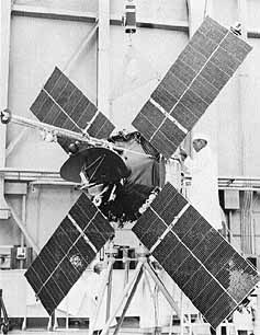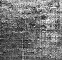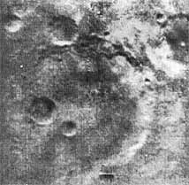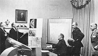 [whole page 78] (Mariner 4 revealed a heavily cratered Mars, more like the moon than like Earth. Photos taken 14 July 1965, just before the closest approach of 9700 kilometers, were radioed back as digital data. At top left, Mare Sirenum, bordering on Atlantis. Above, Atlantis between Mare Sirenum and Mare Cimmerium. At left, bright region, northwestern Phaethontis. Below at the White House 31 July 1964, JPL Director William Pickering shows Ranger 8 photo of the moon to President Johnson. NASA Associate Administrator for Space Science and Applications Homer E. Newell is with him. Behind the president are Dr. Donald F. Horning, special assistant to the president for science and technology, and Dr. Edward C. Welsh, executive secretary, National Aeronautics and Space Council.) |