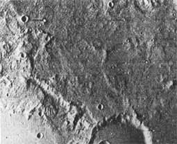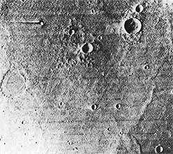 [Whole page 178] Mariner 6 took near-encounter photos of Mars on 31 July 1969. Frame 19 (above), 3613 kilometers from the surface, shows flat-bottomed craters a few kilometers to a few hundred wide, High-resolution frames 20 (left) and 22 (below) show smaller, bowl-shaped craters, resembling primary impact craters found on the moon. |