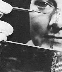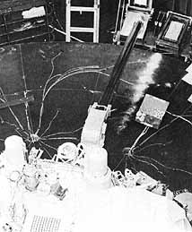 [Whole page 257] (The guidance, control, and sequencing computer was the Viking lander's brain. At right, magnetic wires as fine as human hair are inserted into the computer at Honeywell Aerospace, Saint Petersbury, Florida. In testing below, the HDC-402 computer, part of the lander's computer, looks like pages of a book. At bottom, Jim Martin (second from right) on 10 January 1975 congratulates Barton Geer (left), director of system engineering and operations at Langley; R. Wigley, Honeywell's Viking program manager; and F. X. Carey, Martin Marietta resident manager at Honeywell. GCSC flight article 2 and the qualification unit are in the foreground.) |