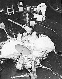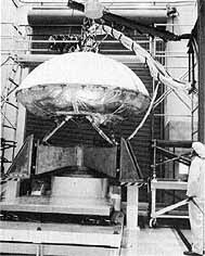 [262] (Viking simulators went through intensive environment tests to ensure the final spacecraft would function far from Earth. Above left, Viking program technician Alonzo McCann adjusts a cable on the proof-test capsule-decelerator assembly, as lander and capsule are prepared for January 1974 heat-verification tests. One of the lander cameras is to the right of center. Above right, a technician watches as an acoustic shroud is lowered over the proof-test capsule before acoustic tests in mid-June 1974. At lower right, the proof-test capsule is lifted out of the vacuum chamber at Martian Marietta, Denver, in October 1974 after a month-long series of rigorous tests to qualify it for operations on Mars.) |
