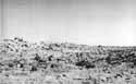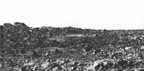 The larger boulders on the horizon are about 90 m distant and about 1 to 2 m in diameter. They appear to be eroded into unusual scalloped shapes, although this may be an illusion rendered by low resolution and high contrast lighting. Finer sediment is banked up within the boulder cluster. The same association of boulders and accumulation of sediment occurs elsewhere in the scene. Knobby bedrock is visible in the foreground, and is described in more detail in the text with figures 52 through 55.