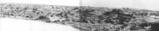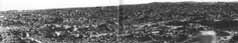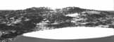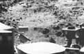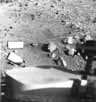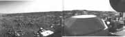 [64-65] These panoramas show the same field of view, looking northwest. Figure 66 was taken in the morning, figure 67 in mid afternoon. The wind cover over the radioisotope thermoelectric generator (RTG) is visible in the foreground. Scalloped drifts or sediment and clusters of boulders accent the landscape. As in other parts of the scene the larger boulders [65] are localized on small hillocks and appear to be either loci for the accumulation of sediment, or stabilizing elements for residual sediment. The small parallel ridges in the left half of figure 66 superficially resemble wind generated ripple marks, but are probably caused by exposed layering in the drift material. |