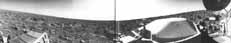 [78-79] Figure 82 is the second picture taken by Lander 2, a low resolution panorama that was completed about 20 min after touchdown. The most striking feature is the sloping horizon. Recall that the picture is assembled from left to right. As we looked at the first few lines all we could tell was that the horizon dipped to the right. Although it was possible that this was an actual feature within the scene, we suspected otherwise. As the image continued and we watched the horizon regularly descend and then climb back up our suspicions were confirmed. The horizon was, in fact, very nearly level but the spacecraft was tilted approximately 8° toward the northwest. The effective result is that in the middle of the panorama, looking toward the southeast, the camera is tilted up and the horizon appears near the bottom of the image. Pointing in the opposite direction, northwest, the camera's field of view is tilted downward and the horizon appears near the top of the image.