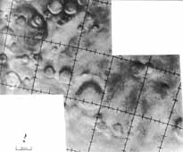 Mariner 4, launched in 1964, weighed only 262 kg and carried only a small science payload. As it flew by Mars at a minimum range of slightly less than 10 000 km, it returned 21 pictures of the planet. An airbrush mosaic of two of the better Mariner 4 frames is shown here. The resolution is approximately one kilometer, about 150 times better than Earth-based photographs. The pictures show a cratered surface that superficially resembles the Moon, a result that was somewhat disappointing in view of some of the more extreme expectations. Certainly, no canals were observed.