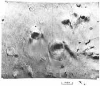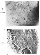 In 1969, twin spacecraft, Mariner 6 and Mariner 7, were sent to examine Mars. Like Mariner 4, these spacecraft were flybys, and between them they acquired 201 images that were a blend of low-resolution, wide- area frames and nested, high-resolution frames. A typical image pair is shown in the frames taken south of Sinus Sabaeus. The highest resolution achieved was approximately 500 meters. Again, most of the area photographed resembled the Moon, and craters dominated the landscape. Only a few pictures displayed nonlunar-like features, such as chaotic and featureless terrains, that might have hinted at what remained to be discovered. In fact, the two spacecraft had passed over only those parts of the planet that retain an ancient cratered surface, and they had missed the parts of the planet that have younger and more diverse geological features.