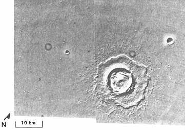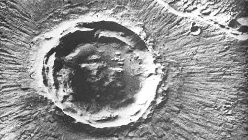 The Viking orbiter pictures revealed some unique characteristics of Martian impact craters. The ejecta pattern around most fresh Martian impact craters is distinctively different from that around lunar and mercurian craters. On the Moon and on Mercury, the ejecta typically have a coarse, disordered texture close to the rim. Farther out, the texture becomes finer and, with increasing radial distance, grades imperceptibly into dense fields of secondary craters and rays. Most Martian craters have quite a different ejecta pattern. The ejecta commonly appear to consist of several layers, with the outer edge of each marked by a low ridge or escarpment. Features on the ejecta surfaces include closely space radial striae and concentric grooves, ridges, and scarps, especially toward the outer margin. These unique Martian features were seen vaguely in the Mariner 9 pictures and tentatively attributed to wind action.
