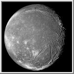 Esta imagem de Ariel mostra um mundo crivado de crateras. Ao longo da superfície