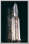 At Launch Complex 40 on Cape Canaveral Air Station, the Mobile Service Tower has been retracted away from the Titan IVB/Centaur carrying the Cassini spacecraft. The launch vehicle, Cassini spacecraft and attached Centaur stage encased in a payload fairing, altogether stand about 183 feet tall; mounted at the base of the launch vehicle are two upgraded solid rocket motors. (Courtesy Kennedy Space Center)