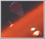 This artist's rendering shows the European Space Agency's Huygens probe descending into the atmosphere of Saturn's moon Titan after being released by NASA's Cassini spacecraft. (Courtesy ESA)