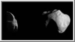miles across) almost fully lit by the Sun at a phase angle of 43° (right image). Mathilde's irregular shape results